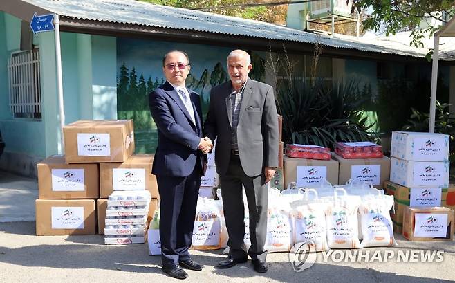 (테헤란=연합뉴스) 이승민 특파원 = 윤강현 주이란 한국대사(왼쪽)가 25일(현지시간) 이란 테헤란 근교 요양시설을 찾아 마스크 등을 전달한 뒤 기념촬영을 하고 있다. 2021.10.25