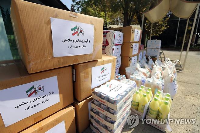 (테헤란=연합뉴스) 이승민 특파원 = 25일(현지시간) 이란 테헤란 근교 요양시설에 주이란 한국대사관이 전달한 지원 물품 박스에 "행복과 건강을 바라며"라는 문구가 쓰여있다. 2021.10.25