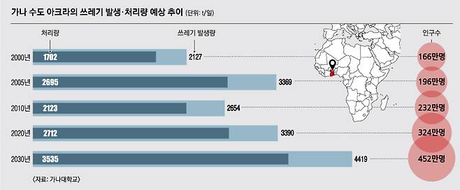 가나 어린이재단 활동가인 이브라힘 무민은 가나의 도시화가 폐기물 처리시설과 정책 없이 너무 급속히 진행된 것이 원인이라고 진단했다. “가나 인구가 3000만명인데 인구당 일일 발생 폐기물은 0.47㎏ 정도예요. 통계에 잡히지 않는 쓰레기가 훨씬 더 많죠. 관리가 어려운 헌옷, 타이어 수입이 쓰레기 문제를 가중시키고 있어요. 정부가 폐기물 처리에 손을 놓으니 민간업체나 주민들이 전자 폐기물, 플라스틱을 태웁니다. 그 과정에서 온실가스가 배출되면 기후변화에도 악영향을 줄 수밖에 없어요.”