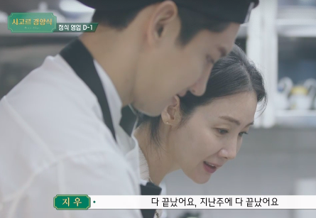분위기를 몰아 실전처럼 연습하기 위해 옷부타 갈아입었다. 모두 긴장감과 초조함이 감돈 가운데 각자 위치로 이동했다. 홀팀에서 최지우는 주방에 들어가 냉장고를 꼼꼼하게 살피며 총괄 사장다운 면모를 뽐냈다.