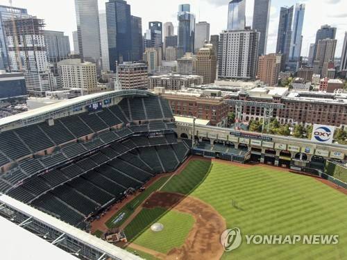 epa09546057 An aerial photo made with a drone shows Minute Maid Park with the roof open in downtown Houston, Texas, USA, 25 October 2021. The American League champion Houston Astros will face The National League champion Atlanta Braves in the best of seven game World Series at Minute Maid Park beginning 26 October. EPA/TANNEN MAURY