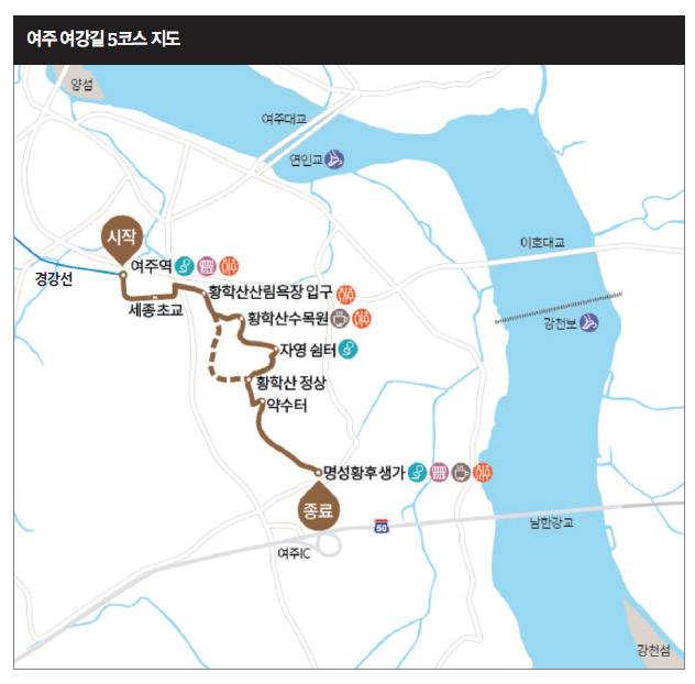 현재 여강길은 총 11개 코스, 118.8km로 이루어져 있다. 이 중 술아원과 가까운 곳에 있는 코스가 5코스 ‘황학산길’이다. 이 코스는 여주역에서 시작해 명성황후 생가에서 끝나는 6.5km 단거리 코스다.