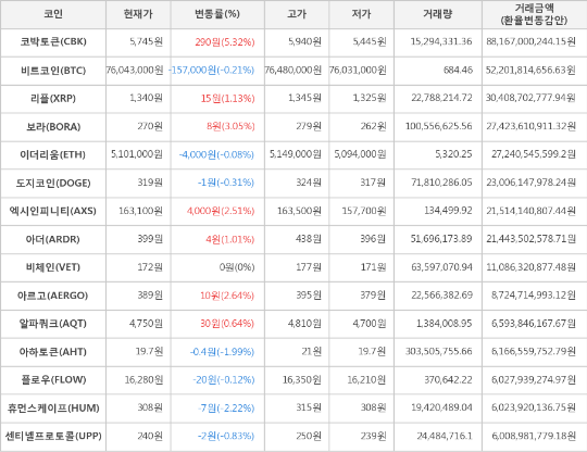 또한, 아하토큰(-1.99%, 19.7원), 센티넬프로토콜(-0.83%, 240원), 도지코인(-0.31%, 319원), 플로우(-0.12%, 16,280원), 이더리움(-0.08%, 5,101,000원)이 하락세를 나타냈다.