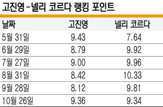 고진영은 지난 24일 미국여자프로골프(LPGA)투어 BMW레이디스챔피언십에서 정상에 오르면서 1위로 복귀했다. 고진영은 지난 6월 마지막 주 세계랭킹에서 코르다에게 1위를 내줬다. 고진영은 지난 9월 캄비아포틀랜드클래식에서 우승하면서 가파른 상승곡선을 그리고 있다. 최근 5차례 출전에서 고진영은 우승 3회, 준우승 1회를 거뒀다. 반면 코르다는 최근 두 달간 공식 대회에 1번 출전했다.