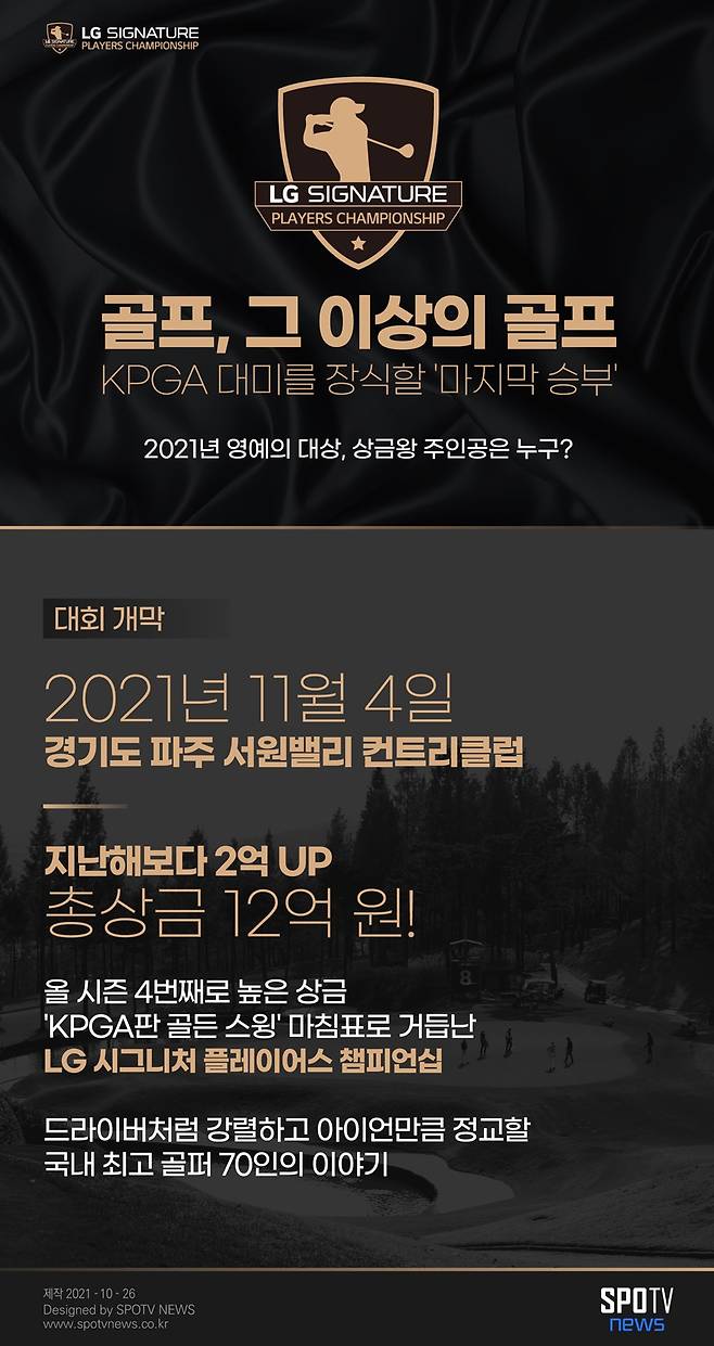 [스포티비뉴스=배정호, 박대현 기자] 2021년 한국프로골프(KPGA) 코리안투어 대미를 장식할 LG 시그니처 플레이어스 챔피언십이 다음 달 4일 경기도 파주 서원밸리 컨트리클럽(파72)에서 펼쳐진다.