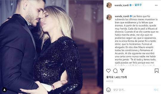 [마이데일리 = 김건호 기자]'막장 커플' 마우로 이카르디-완다 나라가 재결합을 암시하는 메시지를 전했다. 10일 만에 재결합이다.