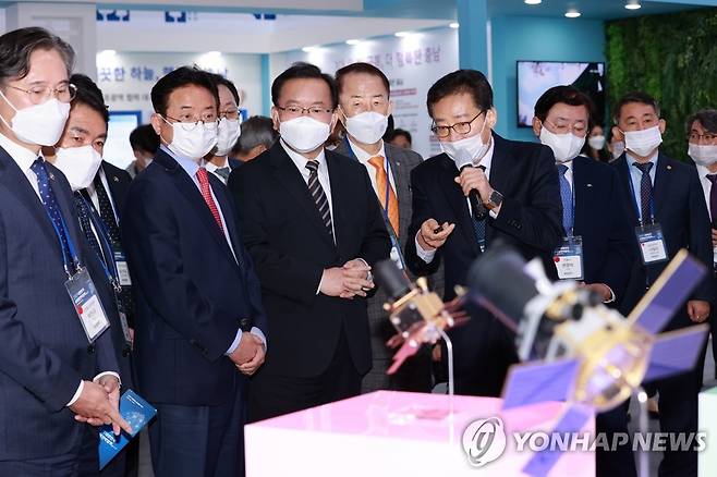 (안동=연합뉴스) 홍해인 기자 = 김부겸 국무총리가 26일 오후 경북 안동시 안동탈춤공연장에서 개막한 2021 대한민국 균형발전 박람회에 참석, 대전 전시관에서 인공위성 모형에 대한 설명을 듣고 있다. 2021.10.26