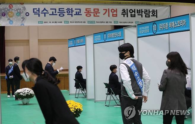 (서울=연합뉴스) 백승렬 기자 = 26일 오후 서울시 성동구 덕수고등학교에서 열린 '동문기업 취업박람회'에서 3학년 학생들이 취업면접을 보기 위해 대기하고 있다. 2021.10.26