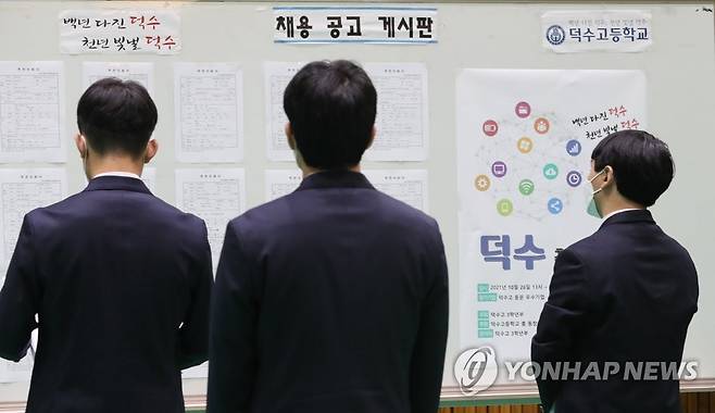 (서울=연합뉴스) 백승렬 기자 = 26일 오후 서울시 성동구 덕수고등학교에서 열린 '동문기업 취업박람회'에서 3학년 학생들이 취업게시판을 보고 있다. 2021.10.26