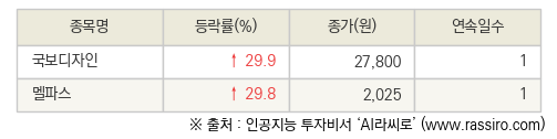 [fnRASSI]오늘의 상한가, 국보디자인 29.9% ↑