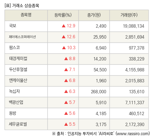 [fnRASSI]장마감, 거래소 상승 종목(국보 12.9% ↑)