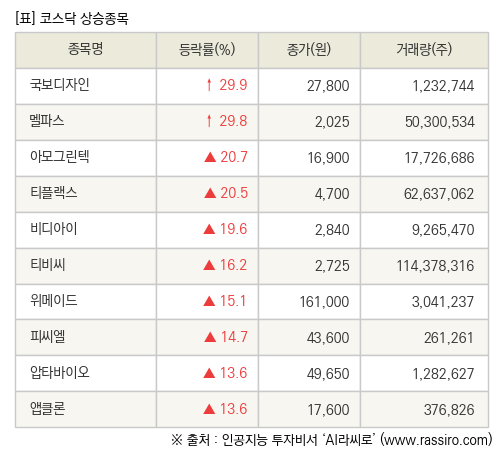 [fnRASSI]장마감, 코스닥 상승 종목(국보디자인 29.9% ↑)