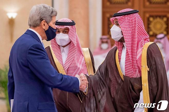 (리야드 AFP=뉴스1) 신윤하 기자 = 25일(현지시간) 사우디아라비아 리야드에서 열린 중동 그린 이니셔티브 정상회의에서 무함마드 빈 살만 사우디아라비아 왕세자가 존 케리 미국 기후 특사를 맞이하고 있다.