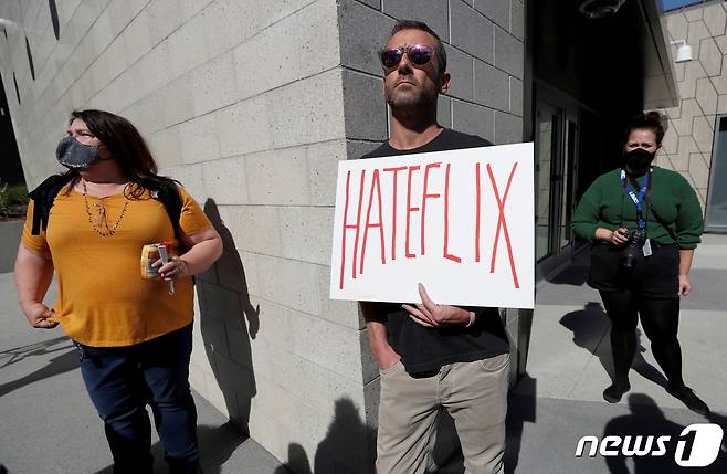 (로스앤젤레스 로이터=뉴스1) 노선웅 기자 = 20일(현지시간) 캘리포니아주 로스앤젤레스에서 한 남성이 성 소수자 조롱 발언으로 논란의 중심에 선 코미디언 데이브 샤펠의 새 코미디 스트리밍에 항의하고 있다.