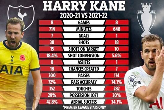 하지만 올 시즌은 예년보다 늦어도 너무 늦다. 케인의 부진은 득점, 도움뿐 아니라 경기력적인 지표에서도 나타난다.