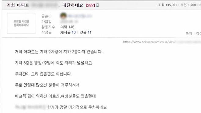 이틀 전 한 온라인 커뮤니티에 "저희 아파트 차량, 참 대단하다"라는 제목의 글이 올라왔습니다.