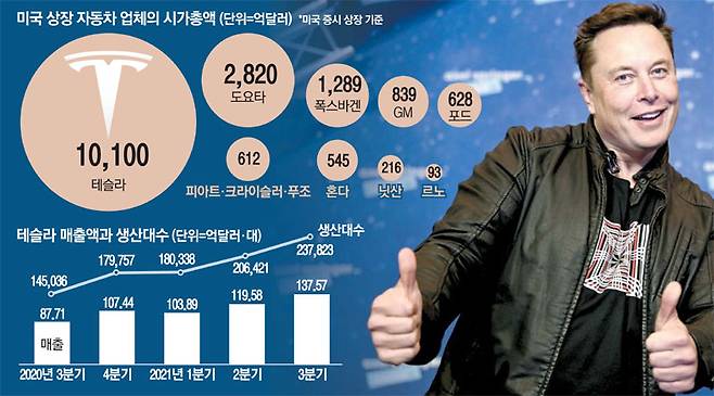 25일(현지시간) 테슬라는 뉴욕 증시에서 직전 거래일보다 12.66% 급등한 124.86달러에 장을 마쳤다. 시총은 1조100억달러까지 치솟았다. 도요타, 폭스바겐, 제너럴모터스(GM), 포드, 피아트·크라이슬러·푸조(스텔란티스), 혼다, 닛산, 르노 등 미국 증시에 상장된 8개 자동차 업체의 시가총액 합 7042억달러보다 43% 높은 수준이다. 이날 주가 급등은 렌터카 업체인 허츠가 2022년 말까지 테슬라의 보급형 세단인 모델3를 10만대 구매할 것이라고 발표한 덕분이다.
