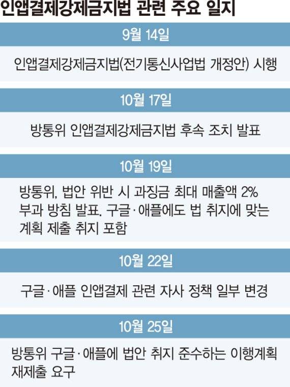 구글과 애플 등 앱(애플리케이션)마켓 사업자들이 최근 인앱결제 관련 정책 일부를 변경하고 나섰다. 방송통신위원회가 지난 9월 14일 시행된 인앱결제강제금지법(전기통신사업법 개정안)의 취지에 부합하는 이행계획 재제출을 촉구한 이후의 변화다. 하지만 업계는 보다 실질적인 조치가 필요하다고 지적했다.