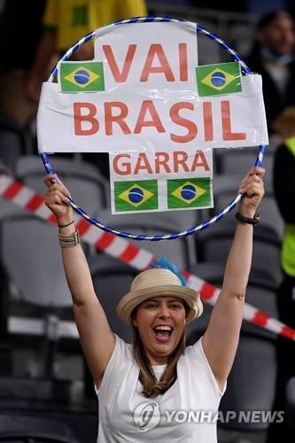 epa09546426 A Brazil supporter holds up a placard ahead of the international women's soccer friendly match between Australia and Brazil at CommBank Stadium in Sydney, New South Wales, Australia, 26 October 2021. EPA/DAN HIMBRECHTS AUSTRALIA AND NEW ZEALAND OUT
