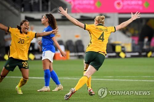 epa09546433 Clare Polkinghorne of Australia (R) celebrates after scoring a goal during the international women's soccer friendly match between Australia and Brazil at CommBank Stadium in Sydney, New South Wales, Australia, 26 October 2021. EPA/DAN HIMBRECHTS AUSTRALIA AND NEW ZEALAND OUT