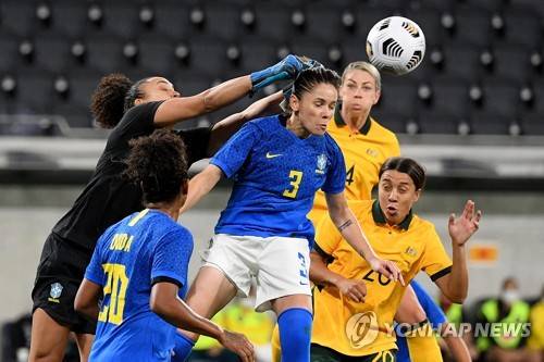 epa09546450 Goalkeeper Leticia of Brazil (L) punches the ball away during the international women's soccer friendly match between Australia and Brazil at CommBank Stadium in Sydney, New South Wales, Australia, 26 October 2021. EPA/DAN HIMBRECHTS AUSTRALIA AND NEW ZEALAND OUT
