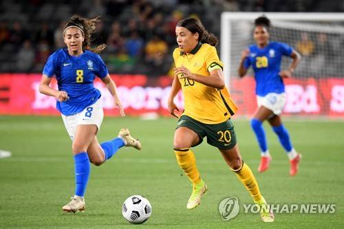 epa09546451 Sam Kerr of Australia (C) controls the ball during the international women's soccer friendly match between Australia and Brazil at CommBank Stadium in Sydney, New South Wales, Australia, 26 October 2021. EPA/DAN HIMBRECHTS AUSTRALIA AND NEW ZEALAND OUT