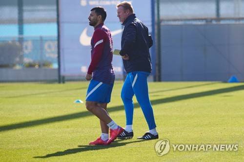 epa09546522 FC Barcelona's Dutch head coach Ronald Koemam (R) with Argentinian striker Sergio 'Kun' Aguero (L) during a training session at Joan Gamper Sports City in Barcelona, Catalonia 26 October 2021 in preparation for their next LaLiga match against Rayo Vallecano. EPA/Alejandro Garcia