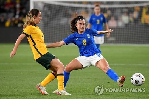 epa09546581 Clare Wheeler of Australia (L) vies for the ball against Angelina of Brazil (R) during the international women's soccer friendly match between Australia and Brazil at CommBank Stadium in Sydney, New South Wales, Australia, 26 October 2021. EPA/DAN HIMBRECHTS AUSTRALIA AND NEW ZEALAND OUT