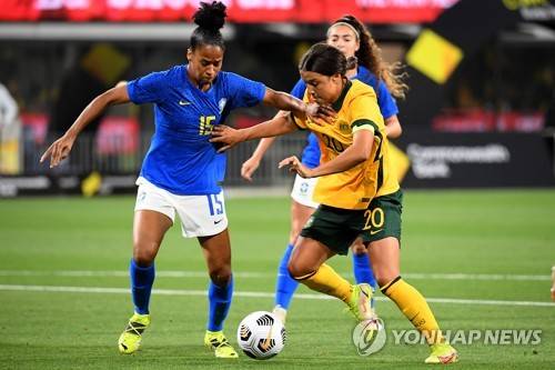 epa09546582 Sam Kerr of Australia (R) vies for the ball against Tainara of Brazil (L) during the international women's soccer friendly match between Australia and Brazil at CommBank Stadium in Sydney, New South Wales, Australia, 26 October 2021. EPA/DAN HIMBRECHTS AUSTRALIA AND NEW ZEALAND OUT