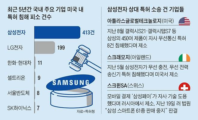 글로벌 시장에서 한국 대표 기업인 삼성전자를 상대로 한 특허 소송은 급격히 늘어나는 추세이다. 특허청에 따르면 삼성은 지난 2017년부터 올 9월까지 미국에서만 413건의 특허 침해 소송을 당했다. 매주 1번꼴로 특허 소송을 벌이고 있는 셈이다. 같은 기간 LG전자(199건), 한화·현대차(각 11건), SK하이닉스(7건) 등 다른 국내 대기업에 비해 압도적으로 많다. 삼성은 다른 글로벌 IT 기업과 비교해도 특허 소송에 자주 휘말리고 있다. 특허 정보 분석 업체 유니파이드페이턴츠에 따르면 삼성은 올 들어 3분기까지 특허 침해 피소송 건수가 58회로 애플(29건), 구글(26건), 아마존(20건)보다 많았다.