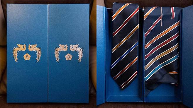이 후보가 받은 선물은 감색 바탕에 빨간색과 노란색, 파란색 사선 무늬가 들어간 넥타이와 스카프 한 쌍으로, 넥타이는 이 후보에게, 스카프는 배우자 김혜경 씨에게 전한 선물로 보입니다.