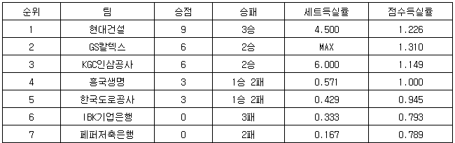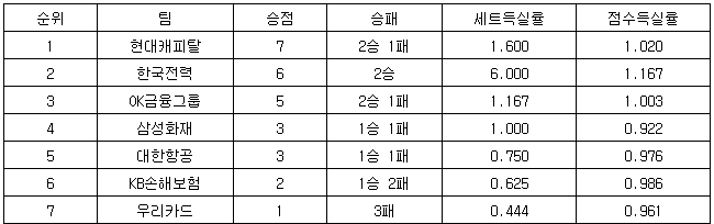 ※순위는 승점-승리 경기 수-세트득실률(총 승리세트/총 패배세트)-점수득실률(총 득점/총 실점) 순.