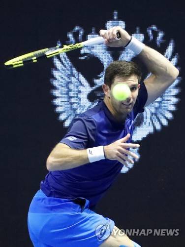 epa09546725 Federico Delbonis of Argentina in action against Pablo Andujar of Spain during their first round match of the St.Petersburg Open ATP tennis tournament in St.Petersburg, Russia, 26 October 2021. EPA/ANATOLY MALTSEV