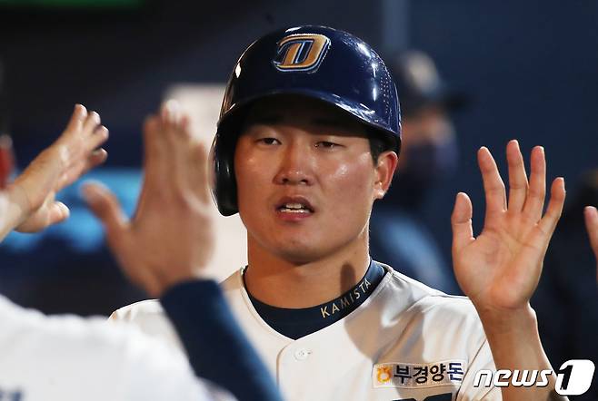 (창원=뉴스1) 여주연 기자 = 26일 오후 경남 창원NC파크에서 열린 '2021 프로야구 신한은행 SOL KBO리그' NC 다이노스와 SSG 랜더스 경기에서 7회말 1사 주자 만루 상황 NC 전민수의 1타점 적시타로 3루주자 정진기가 홈으로 들어와 더그아웃에서 동료들과 기쁨을 나누고 있다. 2021.10.26/뉴스1