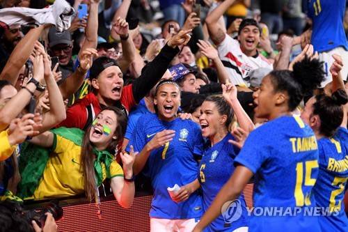 epa09546762 Brazil players greet supporters following the international women's soccer friendly match between Australia and Brazil at CommBank Stadium in Sydney, New South Wales, Australia, 26 October 2021. EPA/DAN HIMBRECHTS AUSTRALIA AND NEW ZEALAND OUT