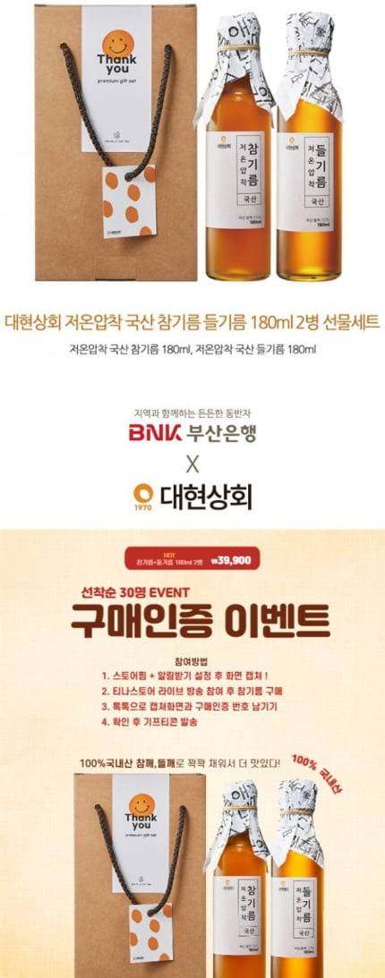 이번 라이브커머스에서는 대현상회의 '2021년 햇깨 저온압착 국산 참기름 들기름 180ml x -2병'을 정가보다 10% 안팎 할인 판매한다. 방송 중 구매하는 고객은 더욱 특별한 혜택을 누릴 수 있다.