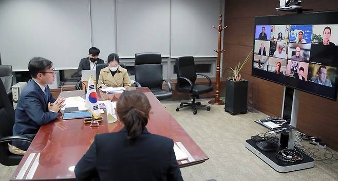 [서울=뉴시스] 고승민 기자 = 산업통상자원부는 26일 여한구 통상교섭본부장이 대한상공회의소에서 응고지 오콘조 이웨알라 WTO 사무총장, 보르게 브렌데 세계경제포럼 이사 등 관계자가 참석한 가운데 열린 '무역 리더쉽 그룹 회의'에 화상으로 참석해 WTO 각료회의 성과 도출 및 개혁 등을 논의했다고 밝혔다. (사진=산업통상자원부 제공) 2021.10.26. photo@newsis.com *재판매 및 DB 금지