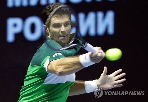 epaselect epa09546784 Pablo Andujar of Spain in action against Federico Delbonis of Argentina during their first round match of the St.Petersburg Open ATP tennis tournament in St.Petersburg, Russia, 26 October 2021. EPA/ANATOLY MALTSEV