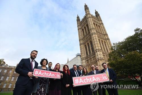 epaselect epa09546781 Irish language activists outside parliament in London, Britain, 26 October 2021. Irish language activists are calling on the UK government to legislate to protect the Irish language. EPA/ANDY RAIN