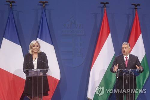 French far-right leader Marine le Pen, left, stands next to Hungarian Prime Minister Viktor Orban during a press conference in Budapest, Hungary, , Tuesday, Oct. 26, 2021. (AP Photo/Laszlo Balogh)