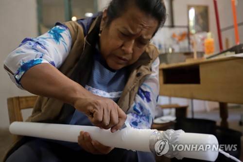 epa09546848 The artisan Maria del Rocio Perez makes scaled candles on the occasion of the Day of the Dead in the municipality of Tochimilco, Puebla state, Mexico on 23 October 2021 (issued 26 October 2021). Flaked wax candles have the power to illuminate the souls at the altars for the Day of the Dead. And in the Mexican municipality of Tochimilco, dozens of artisans keep the tradition alive by making thousands of these objects that light, year after year, the path of those who visit the houses on these dates. EPA/Hilda Rios
