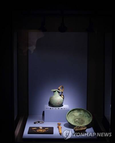 epa09546866 (FILE) A view of the Crimean art collection consisting of, among other items, a golden sword sheath, a show helmet, and numerous jewels, in the Allard Pierson Museum, Amsterdam 21 August 2014 (reissued 26 October 2021). The treasures that the museum kept under its care for more than seven years must now be returned to Ukraine, the Amsterdam Court of Appeals ruled on 26 October 2021. The ruling was the latest development in a long legal dispute about the artworks since the annexation of Crimea by Russia in February 2014. EPA/Bart Maat