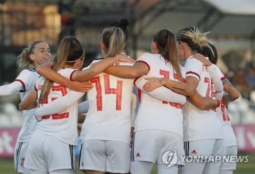 epa09546891 Players of Spain celebrate after scoring the opening goal during the FIFA Women's World Cup 2023 qualifying round group B soccer match between Ukraine and Spain in Kovalivka, Ukraine, 26 October 2021. EPA/SERGEY DOLZHENKO