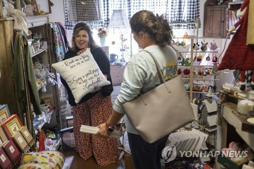 Ginger Pigg suggests a gift to a customer in her gift boutique The Perfect Pigg in Cumming, Ga. on Thursday afternoon, Oct. 22, 2021. She says she is struggling to get products to her store in a timely way. (AP Photo/Ben Gray)