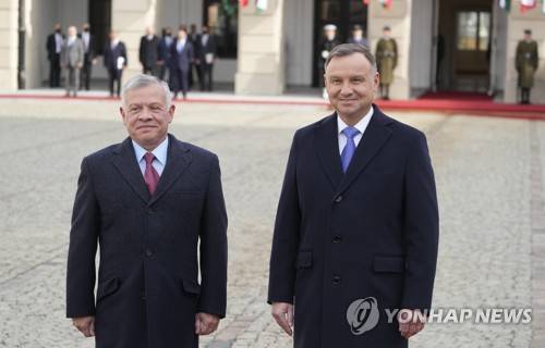 Poland's President Andrzej Duda ,right, welcomes King Abdullah II of Jordan,left, on a one-day visit in a ceremony before the Presidential Palace in Warsaw, Poland, on Tuesday, Oct. 26, 2021. Later, Duda and King Abdullah II of Jordan held talks focused on security and cooperation in the defense sector. (AP Photo/Czarek Sokolowski)
