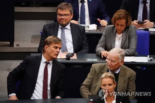 epa09546902 Alternative for Germany party (AfD) candidate for the Bundestag Vice Presidency Michael Kaufmann (back row-L) looks on after not being elected next to Alternative for Germany party (AfD) faction co-chairwoman in the German parliament Bundestag and deputy chairwoman Alice Weidel (front row-R), Alternative for Germany party (AfD) faction parliamentary manager in the German parliament Bundestag Bernd Baumann (2nd row-L), Alternative for Germany party (AfD) honorary faction chairman in the German parliament Bundestag and former chairman Alexander Gauland (2nd row-R) and Alternative for Germany party (AfD) faction co-chairwoman in the German parliament Bundestag and deputy chairwoman Beatrix von Storch during the constituent meeting at the Bundestag in Berlin, Germany, 26 October 2021. The newly elected German Bundestag holds its constituent meeting of Parliament in its 20th electoral period. The meeting will be opened with a speech by the chairman by seniority followed by the election of the President of the Bundestag and the other members of the Presidium, as well as the decision on the agenda of the German Bundestag. EPA/CLEMENS BILAN