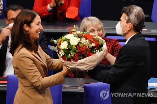 epa09546904 Newly elected Social Democratic Party (SPD) Bundestag Vice President Aydan Ozoguz (L) receives Social Democratic Party (SPD) Bundestag faction chairman Rolf Muetzenich during the constituent meeting at the Bundestag in Berlin, Germany, 26 October 2021. The newly elected German Bundestag holds its constituent meeting of Parliament in its 20th electoral period. The meeting will be opened with a speech by the chairman by seniority followed by the election of the President of the Bundestag and the other members of the Presidium, as well as the decision on the agenda of the German Bundestag. EPA/CLEMENS BILAN
