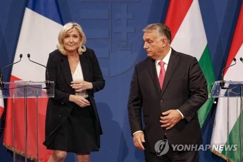 French far-right leader Marine le Pen adjusts her jacket at the end of a joint press conference with Hungarian Prime Minister Viktor Orban in Budapest, Hungary, Tuesday, Oct. 26, 2021. (AP Photo/Laszlo Balogh)