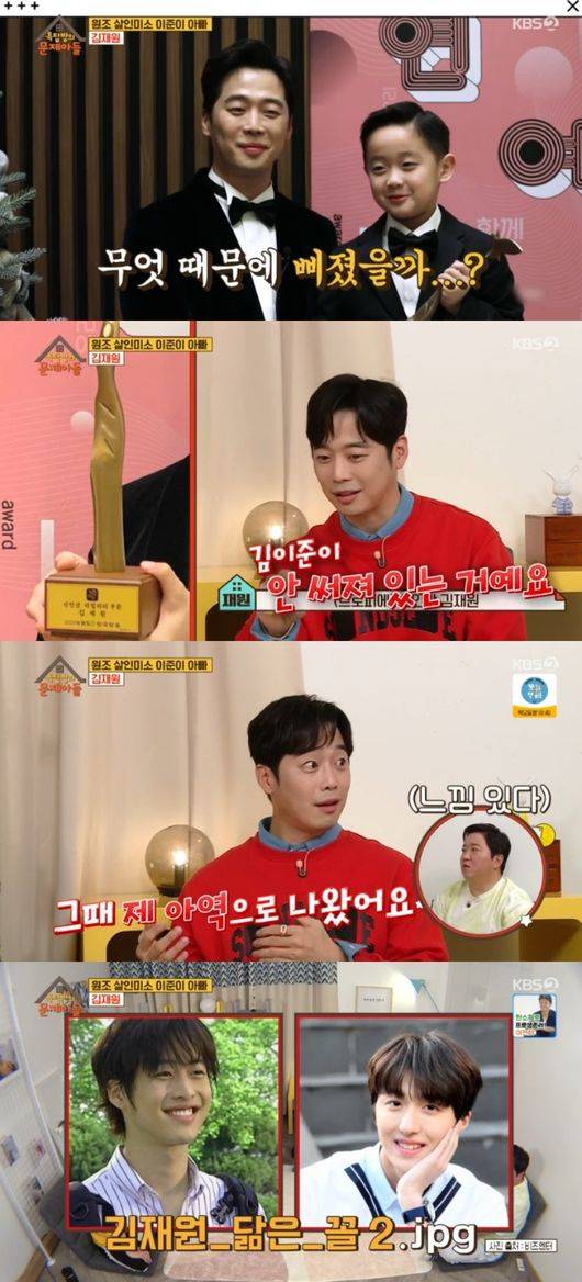 김재원이 신인상을 수상했을 당시 이준이가 토라졌던 일화도 공개됐다. 김재원은 "제가 능력에 비해서 상복이 많았다. 제가 봤을 때는 허접한데 이상하게 생각보다 많이 상을 얻었다. 이준이가 그걸 보고 '나도 아빠처럼 트로피 갖고싶다'는 마음이 생겼더라. 그런데 신인상을 갖고왔는데 '신인상 김재원'이라고만 돼 있고 김이준이 안써있었다. 같이 출연했는데. 그래서 '아빠 왜 내이름은 없어?'라고 물었다"고 설명했다.