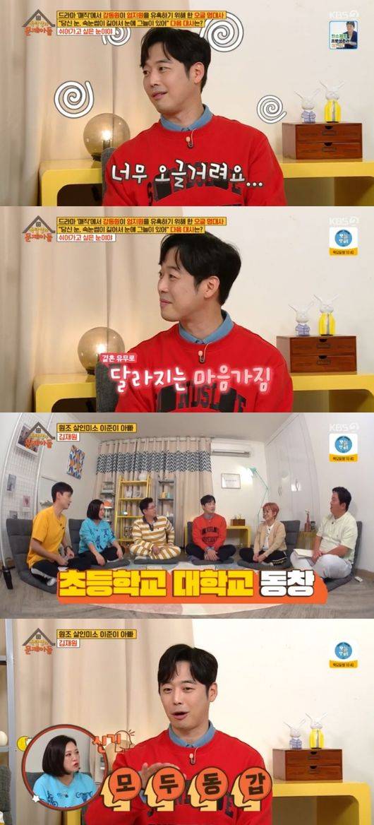 이후 퀴즈를 풀던 중 김재원은 "드라마를 찍다가 오글거리는 대사는 어떻게 하냐"고 묻자 "결혼하고 난 후 멜로신을 찍으면 너무 오글거린다. 결혼 전에 멜로 신을 찍을땐 가능성이 열려있지 않나. 지금은 가능성이 한없이 좁혀져 있다"고 솔직하게 답했다. 민경훈은 "대사 인용해서 아내한테 말한 적 있냐"고 물었고, 김재원은 "저희 와이프가 친구다. 편하게 지내서 그런건 없는 것 같다"고 털어놨다.